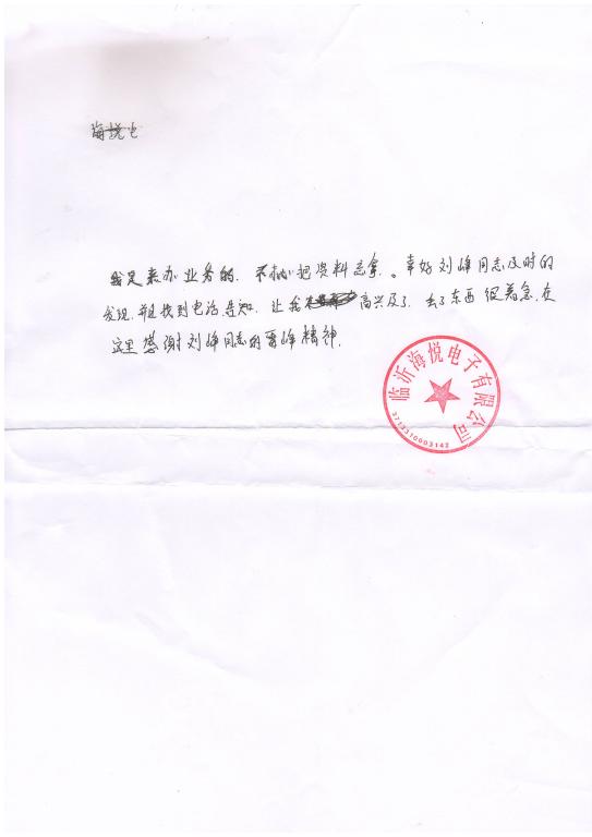 8月15日,临沂海悦电子有限公司的李女士来到商城国际贸易服务大厅办理业务,在工商局16号窗口查询工商信息后就匆匆离去。一时疏忽大意,将带来的营业执照、身份证复印件等公司相关文件落在了工商局窗口,工商局的刘峰看到后,通过工商信息系统,查询到联系人的电话,并及时通知本人取回,避免了因信息泄露给公司造成不必要的损失。李女士拿回资料后,非常感谢我们的工作人员,离开前,手写了一封感谢信表达自己的谢意,赞扬工商局刘峰同志的雷锋精神。